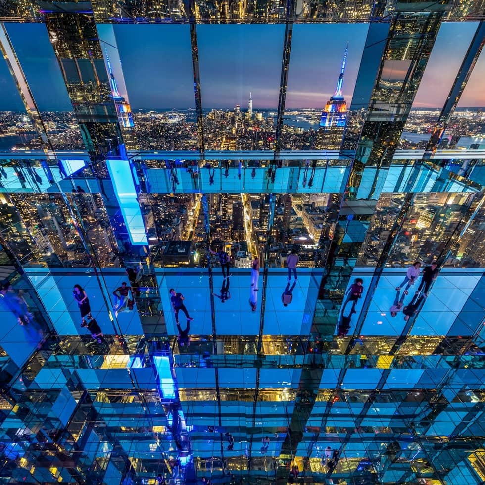 At 1,401 feet above Manhattan, three floors of art and technology reinvent the urban observation experience. Artist Kenzo Digital has designed an space where infinite mirrors, giant reflective spheres, and interactive luminous projections transform your perception of reality. Air envelops you in a labyrinth of reflections where sky and city merge. Affinity plays with physics through metallic orbs that react to your movements. Unity captures your gestures and projects them as dancing luminous motifs. From the exterior terraces, admire the Empire State Building and Chrysler Building from a 360° view. The Levitation experience propels you 300 meters above Madison Avenue in a glass elevator. Each visit is unique thanks to the constant transformations of light installations. Open from 9:00 AM to 10:30 PM (closed Tuesdays).
