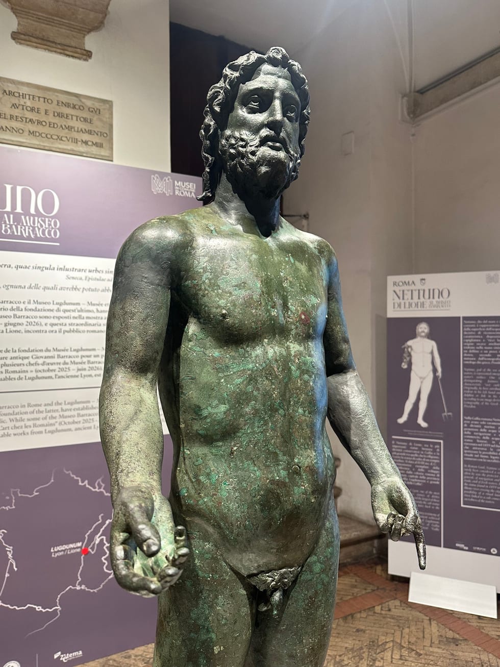 For the first time in Rome, the Museo Barracco presents one of the largest bronzes of Gaul, the Neptune of Lyon. This monumental statue, discovered in the Rhône, is an exceptional loan from the Musée Lugdunum. The god of the sea, represented in all his power, testifies to the artistic richness of the Roman provinces and the quality of Gallo-Roman bronze workshops. Preserved in remarkable condition thanks to its stay in the river waters, the Neptune reveals details of exceptional finesse. Its exhibition in Rome allows for a fascinating dialogue between the Barracco's collections and this masterpiece from Gaul. The statue embodies the diffusion of Roman art throughout the empire and the ability of provincial artists to equal the masters of the capital. A rare opportunity to admire a major archaeological treasure.